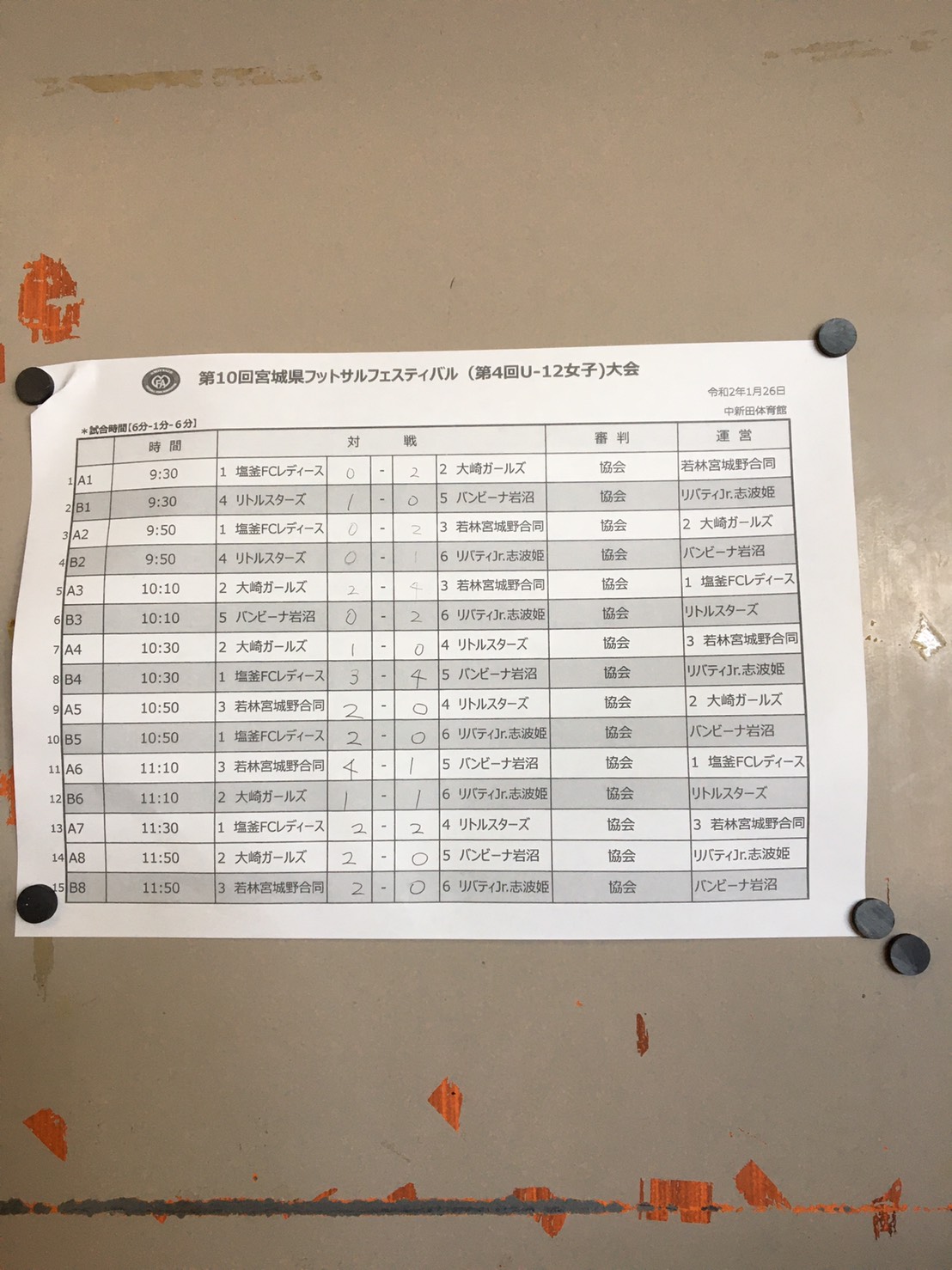お知らせNEWS お知らせ一覧へ 第10回宮城県フットサルフェスティバル(第4回U12女子)大会 2020-01-26ジュニア 第10回宮城県フットサルフェスティバル(第4回U12女子)大会 組み合わせ 応援ありがとうございました。来年にリベンジできるように頑張ります!! 古いお知らせ →