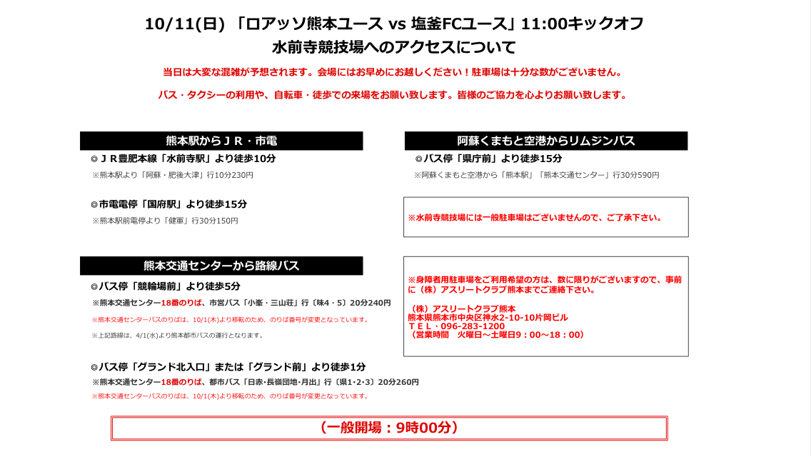 今回、試合が行われる水前寺陸上競技場には各種イベントがあるため、一般駐車場がありません。